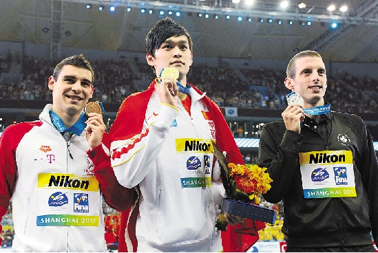 孙杨(中)在领奖台上。