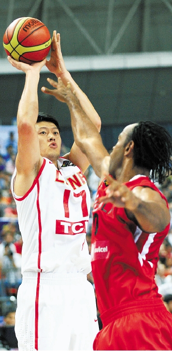 中国队球员莫科(左)在比赛中投篮。 新华社发