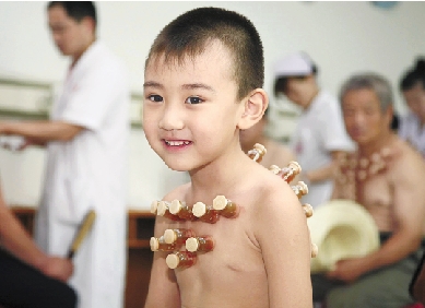 5岁的小浩在接受“冬病夏治”拔罐治疗。