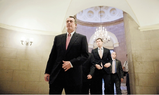 8月1日,在美国首都华盛顿,美国众议院议长博纳(左)步入众议院大厅投票。 新华社发