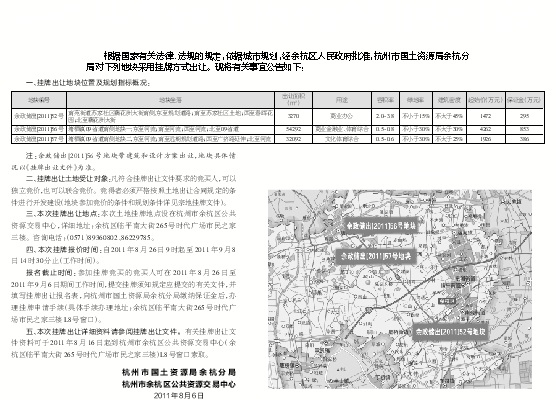 五、本次挂牌出让详细资料请参阅挂牌出让文件。有关挂牌出让文件资料可于2011年8月16日起到杭州市余杭区公共资源交易中心(余杭区临平南大街265号时代广场市民之家三楼)L8号窗口索取。