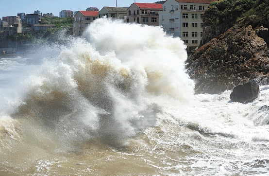 5日下午,温岭市石塘镇三岙村海边风力已增强到9级以上,巨浪拍打着岸边礁石,浪花高达20多米。 吴元峰 金宗炳 吴鹏飞 摄