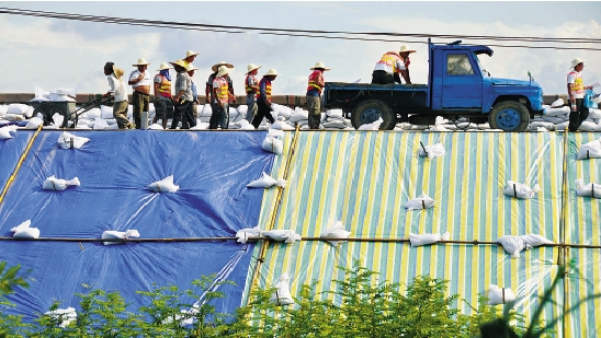 8月5日,在钱塘江海宁丁桥大缺口段,省防汛机动抢险总队钱塘江支队正在对700多米的海塘进行加固。 海宁日报记者 陈杰 摄
