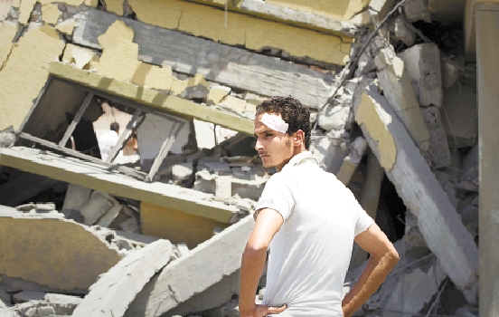 北约4日对兹利坦的空袭造成32人死亡,图为一名男子站在被炸毁的民房前,房内的一位母亲和两个孩子在空袭中遇难。 新华社发
