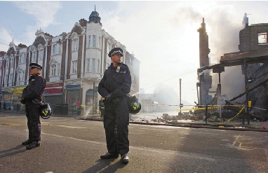 8月7日,警察在英国伦敦城北托特纳姆区被焚烧的商店附近警戒。