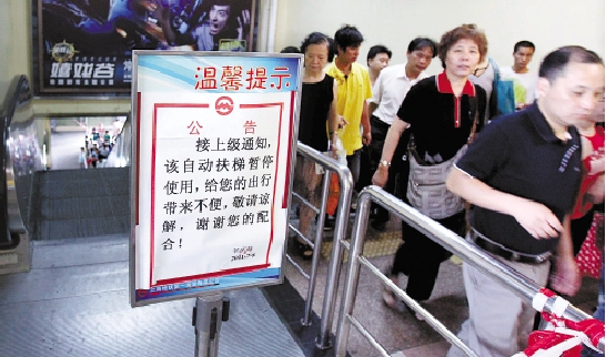 自7月8日起,上海地铁停止使用22台奥的斯品牌“513MPE”型自动扶梯,进行全面检修。乘客在莘庄地铁站走楼梯进站(2011年7月12日摄)。 新华社记者 刘颖 摄