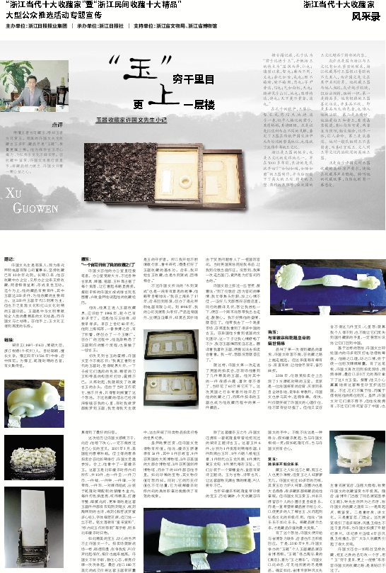 许国文先生是慈溪人,现为甬光照明电器有限公司董事长,坚持收藏已有10余年光阴。长期以来,他在收藏中办企业,又用办企业来支持收藏,两者相得益彰,形成良性互动。迄今为止,他的藏品有数百件,其中玉器达200多件,为他收藏的主要部分。这200件玉器年代以明清为主,但也不乏良渚文化和红山文化时期的玉器珍品。玉器是中华文明奉献给全人类的最精美的文化结晶,而许国文与之结缘。在他手上,玉文化正得到高度的弘扬。