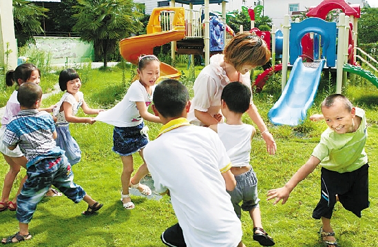 8月9日,来自贵州的郭真武(右一)与小伙伴在玩游戏。郭真武父母都在德清务工,县妇联组织的夏令营,为外来孩子提供免费吃住、教学和娱乐。 宣宏 摄
