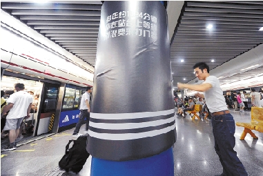 8月9日,上海地铁1号线徐家汇站台的“宣泄柱”供乘客挥拳踢腿发泄减压。据介绍,“宣泄柱”是由圆形软垫制作而成的个性广告牌。 视野网供图