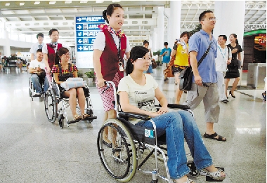 8月11日是全国第二个“肢残人活动日”,杭州市萧山国际机场举行了第八届全国残运会保障服务演练,参与者亲身体验残疾人运动员抵达、安检、登机和行李提取等流程中工作人员的服务措施。 新华社发