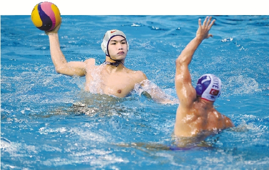 8月11日,中国男子水球队球员张楚锋(左)在比赛中进攻。当日,第26届世界大学生夏季运动会男子水球比赛在深圳市宝安区游泳馆揭开战幕。中国队在首场比赛中以14比7击败土耳其队,取得开门红。