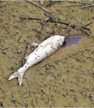江西南昌县蒋巷镇河流水位下降,河中的鱼因缺水而死亡(8月6日摄)。 新华社记者 郭强 摄