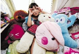床上堆满了城里哥哥、姐姐送来的玩具,小嘉雯还在企盼什么呢?