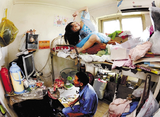 4平方米小屋,爷爷睡下铺,嘉雯睡上铺。