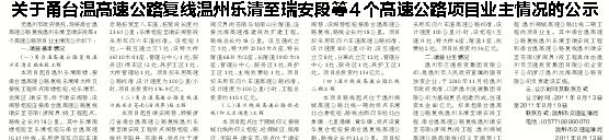受温州市政府委托,现将甬台温高速公路复线温州乐清至瑞安段等4个高速公路项目业主情况公示如下: