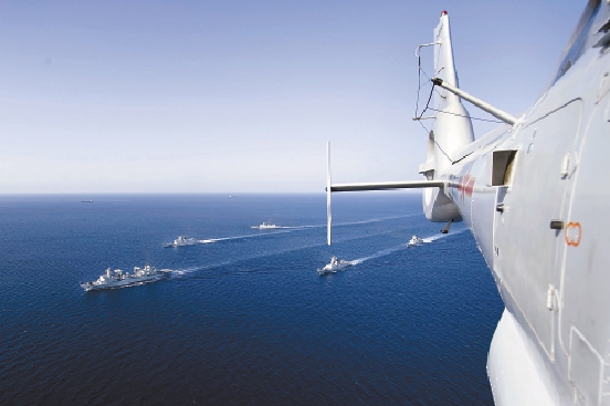 3月16日,中国海军第七、第八批护航编队的舰艇在亚丁湾编队航行。 新华社发