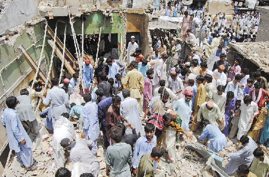8月14日,巴基斯坦当地居民在俾路支省一处建筑物废墟处寻找幸存者。 新华社发
