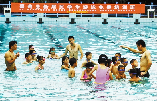 | 嘉善县泗洲游泳池内,一批新居民子女正在教练指导下学习游泳。暑假期间,嘉善开展了新居民子女免费培训游泳的活动。通讯员 胡凌翔 县报道组 刘文书 摄 |