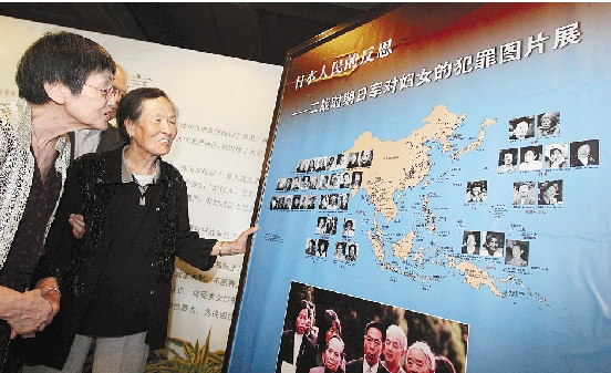 8月14日,“日本人民的反思——二战时期日军对妇女的犯罪图片展”在北京中国人民抗日战争纪念馆开幕。图为来自山西盂县的侵华日军性暴力受害者刘面换(左二)、受害者南二仆的女儿杨秀莲(左一)在参观展览。 新华社发