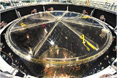 有助破解宇宙“反物质消失”之谜 据新华社8月15日电 8月15日,记者从中科院高能物理研究所获悉,大亚湾反应堆中微子实验国际合作组在京宣布,位于广东大亚湾核电站内地下100米深、距反应堆仅360米的近点实验大厅内,安装就位的两个中微子探测器已经探测到来自核电站反应堆群的中微子。中微子是一种极难被探测到的基本粒子,它有三种类型,可以通过振荡从一种类型转变成另一种类型。大亚湾实验是对中微子的第三种振荡模式的测量。这最后一个未知的混合角数值的大小决定了未来中微子物理研究的发展方向,并且与宇宙中“反物质消失之谜”有关。 图为大亚湾实验在洁净间中组装的中心探测器。 新华社发 |