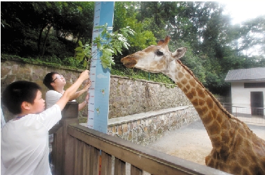 “来来来,把头抬起来。”8月17日,参加杭州动物园爱动物科普之旅的20多个孩子,接过饲养员准备的树枝,把长颈鹿引到测量卡边量身高。 本报记者 林云龙 摄