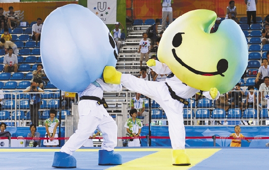 8月18日,在深圳第26届世界大学生夏季运动会跆拳道项目首日比赛间隙,进行现场表演的UU也有模有样地玩起了跆拳道。 新华社发