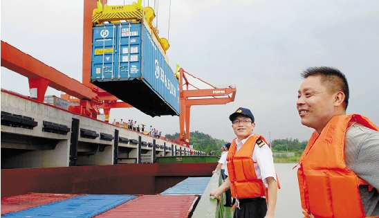 8月18日,安吉川达物流码头上,安吉一批外贸集装箱装上内河运输船,经长湖申线运到上海港后出口欧美。 “中国莱茵河”——长湖申线浙江段提升为千吨级航道后,实现了沿海港口和湖州内河港口的水路对接,改写了湖州港水路集装箱运输量为零的历史。据测算,安吉集装箱船跑一趟上海港,与公路汽车运输相比,少耗燃油2520升,节约运输成本1.44万元,全年可为企业节省近亿元运输成本,减少二氧化碳排放量27210吨。 周雨顺 刘军 摄 |