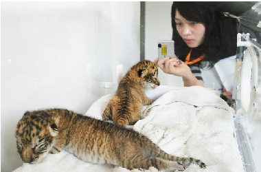 昨天,宁波雅戈尔动物园饲养员正在给两只刚出生、躺在恒温育婴箱里的狮虎兽拍照。它们是母东北虎“同乐”与公非洲狮“同心”的结晶。目前世界上存活的狮虎兽只有20只左右。 宁波晚报记者 龚国荣 摄