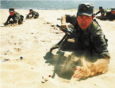 连日来,舟山市气温高达34℃以上,某部官兵在舟山市桃花岛海训。 胡社友 翁舟梁 摄