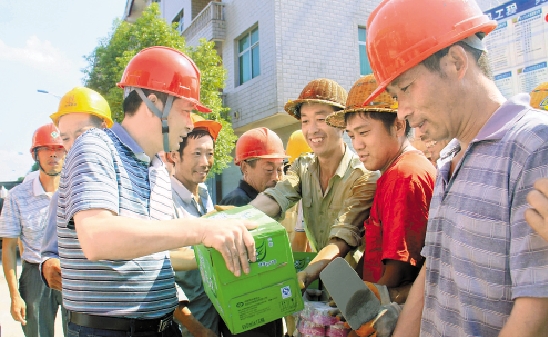 8月20日,东阳市南马镇花园村某建设工地上,花园建设集团管理人员给一线员工送上饮料、毛巾、藿香正气水等防暑消暑物品。 东阳日报记者 包康轩 通讯员 朱杰 摄