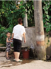 住在水库边上的村民只敢喝山水。