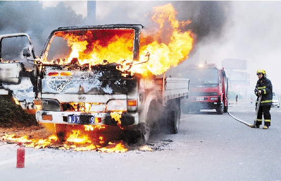 日前,温岭市东环高架锦屏加油站门口,一辆小货车在行驶时突然自燃。 金云国 摄