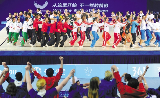 8月22日,深圳第26届世界大学生夏季运动会健美操比赛落下帷幕。全部比赛结束后,现场参赛运动员及教练员、裁判员挥手舞动,台上台下互动联欢,气氛热烈。 新华社发