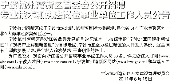 为广揽贤才,现面向浙江省公开招聘事业单位工作人员30名。详见浙江人才网(www.zjrc.com)、宁波人才网(www.nbrc.com.cn)、宁波杭州湾新区网站(www.hzw.gov.cn)和慈溪人才网(www.cxhr.com)。