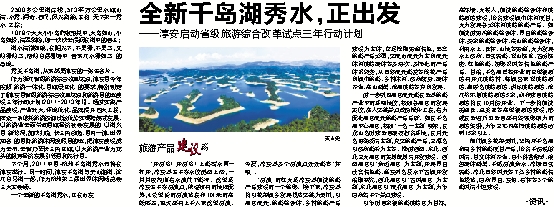 作为浙江省级旅游综合改革试点,淳安县今年按照“旅游一体化、县域景区化”的要求,特别制定了《淳安县省级旅游综合改革试点和旅游目的地建设三年行动计划(2011~2013年)》。通过实施产品建设、产业壮大、环境优化、品牌提升四大工程,探索一条依托旅游资源比较优势实现跨越式发展、以旅游业全面带动县域经济社会发展的“以湖兴县”新路径,加快打造“长三角首选、国内一流、世界知名”的国际旅游休闲度假目的地,把淳安建设成为全市、全省乃至长三角区域,以大旅游产业为龙头的服务经济发展引领县和先行县。