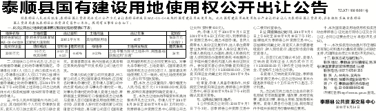 经泰顺县人民政府批准,泰顺县国土资源局决定以公开方式出让泰顺县新城区MZ-01-04地块的国有建设用地使用权。此次国有建设用地使用权公开出让的出让人为泰顺县国土资源局,具体组织实施由泰顺县国土资源局委托泰顺县公共资源交易中心承办。现将有关事项公告如下:
