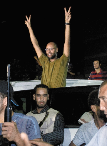 8月23日凌晨,在卡扎菲家族位于利比亚首都的黎波里的住所附近,卡扎菲次子赛义夫向支持者和媒体记者做出胜利手势。 新华社发