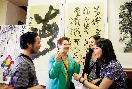 | 近日,第十一届巴黎中国文化艺术交流展在法国巴黎隆重开幕,本次展览是一次跨国性的文化艺术交流活动,也是我国书画史上规模最大的跨国展事之一。参加此次展出的有来自全国二十多个省市的40余位书画艺术家,我省书法家陶雪华作为代表团成员出展,并获得法中文化艺术交流中心颁发的“中欧文化艺术特使”称号。图为陶雪华(左)在与法国艺术家进行交流。 文轩 摄影 |