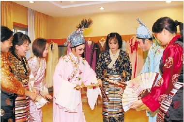 由绍兴市演出有限公司等制作的越剧明星版《梁祝》近日在拉萨上演,这是百年越剧首次走入西藏。图为演员与西藏同胞交流。 记者 金敖生 通讯员 毛翔 摄