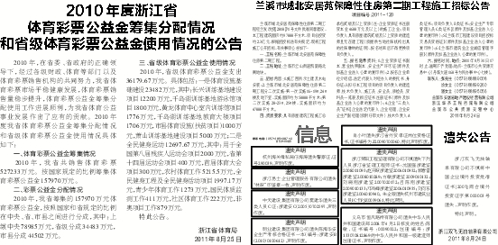 2010年,省级体育彩票公益金支出36179.67万元。具体包括:一是体育设施基础建设23482万元,其中:长兴训练基地建设项目12200万元,千岛湖训练基地游泳馆项目1800万元,黄龙体育中心室内训练馆项目1776万元,千岛湖训练基地教育大楼项目1706万元,市县体育设施(扶贫项目)1000万元,萧山训练基地建设项目5000万元;二是全民健身运动12697.67万元,其中:用于全国第八届残疾人运动会项目2000万元,省第十四届运动会项目400万元,首届体育大会项目300万元,农村体育工作5215.5万元,全民健身工程及全民健身活动项目1997.17万元,青少年体育工作1273万元,国民体质监测工作411万元,社区体育工作222万元,非奥项目工作879万元。