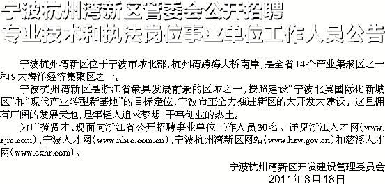 为广揽贤才,现面向浙江省公开招聘事业单位工作人员30名。详见浙江人才网(www.zjrc.com)、宁波人才网(www.nbrc.com.cn)、宁波杭州湾新区网站(www.hzw.gov.cn)和慈溪人才网(www.cxhr.com)。