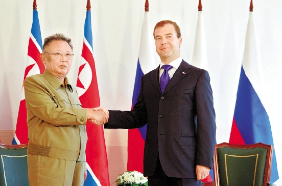 8月24日,在俄罗斯布里亚特共和国首府乌兰乌德附近的军事基地,俄总统梅德韦杰夫(右)与到访的朝鲜最高领导人金正日握手。 新华社发