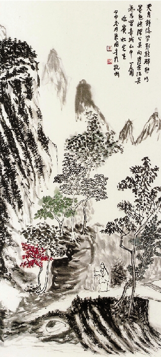 | 山水(国画)133X58cm 2004年作 朱国才 山水画至宋元而为之一变,绘事不再是“解衣磅礴”的专业者所为,岩穴高士、轩冕勋戚、文人墨客、僧道医卜抑或引车卖浆者流,或游戏笔墨,或逸笔草草。黄宾虹探赜索隐,溯源寻流,于看似“粗头乱服”中饱含“水墨淋漓、浑厚华滋”之风韵。国才先生深悟于此,在挥洒书道之余,以黄宾虹先生为圭臬,常看常读常临。数载寒暑,几度春秋,国才先生凭借自己深厚的书法功底,中锋侧锋,皴擦勾染,赭绿丹青,工写随意,其山水画作于天真烂漫中弥漫着浓浓的书卷气。 (应霁民) |