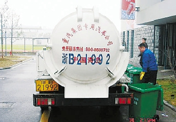 环卫工人在收运餐厨垃圾。陈醉 摄