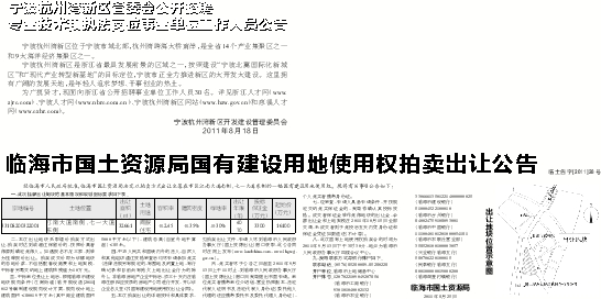 临海市国土资源局国有建设用地使用权拍卖出让公告