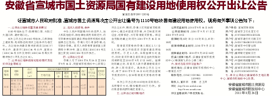 经宣城市人民政府批准,宣城市国土资源局决定公开出让编号为1110号地块国有建设用地使用权。现将有关事项公告如下: