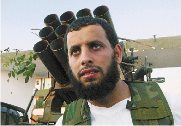 这是8月24日,在利比亚首都的黎波里,一名利比亚反对派武装人员站在火箭炮前。 新华社发