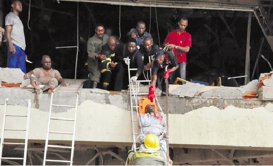 8月26日,在尼日利亚阿布贾,救援人员搬运爆炸中的受伤者。 新华社发