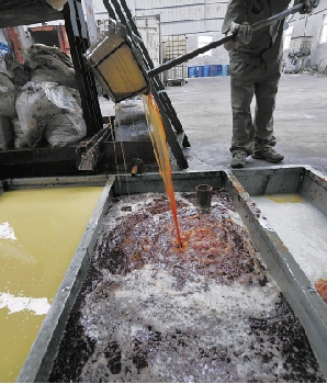 ◀工人们在反复观察“地沟油”加工过程中的变化,确保生物柴油质量。