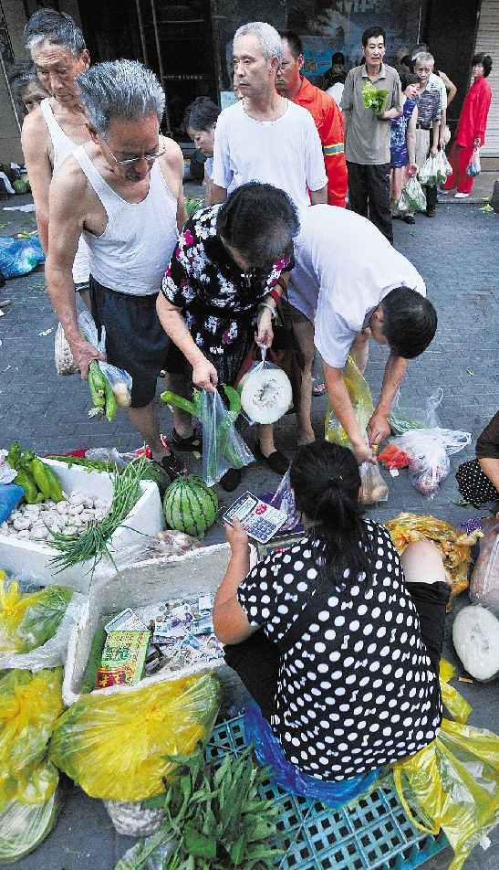 一个菜摊前,排起了10多人的长队。